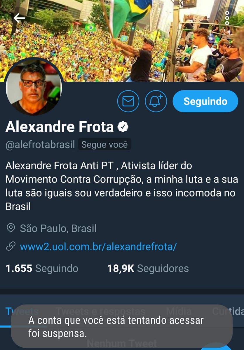 O ator e ativista Alexandre Frota teve uma ingrata surpresa ao ter sua conta suspensa no Twitter, uma das principais redes sociais. Frota participa do Movimento Contra à Corrupção e crítico ferrenho contra o PT.