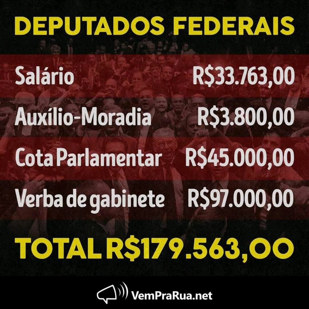 Não, esses valores não são encontrados em nenhum lugar do mundo! Exigimos o fim das mordomias dos Deputados e Senadores ou trabalharemos pelo resto da vida para sustentar essa organização criminosa que roubam e zomba do povo brasileiro. Tenha pena do nosso país, não reeleja, nem eleja nenhum corrupto. São genocidas, legislam em causa própria. Veja a tabela abaixo e repasse essa informação com o movimento, "Muda Brasil."